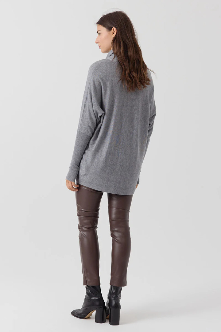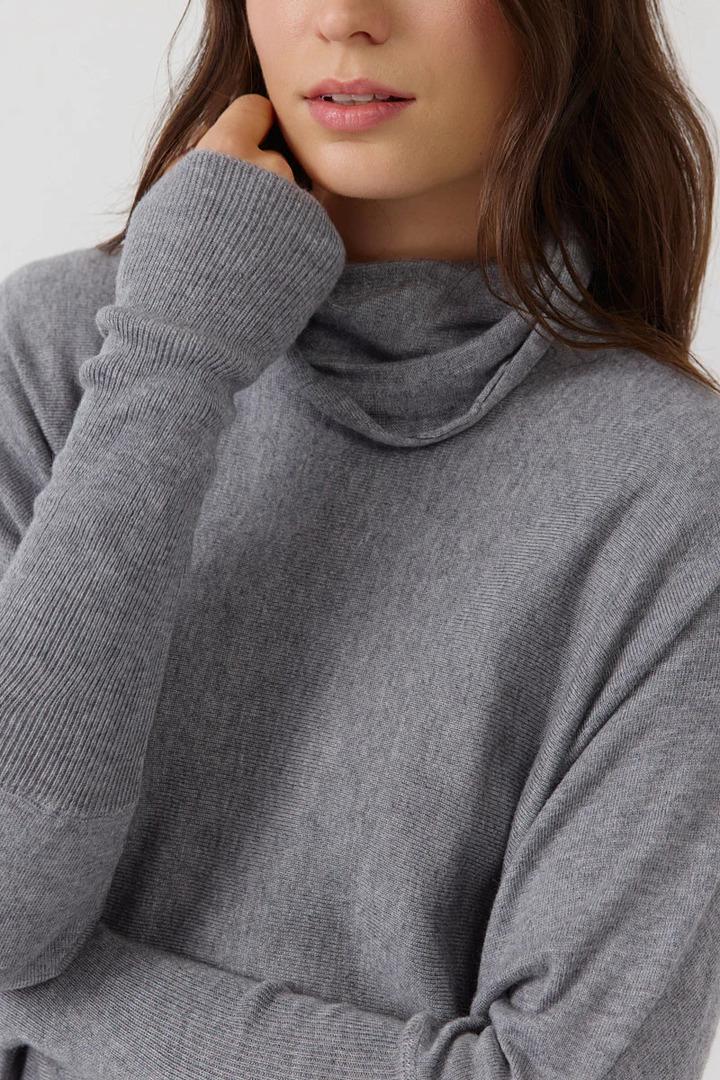 Boat neck sweater in soft, fluffy knit. Three-quarter length wide sleeves. V-neck at the back with tie closure. Loose, feminine fit.