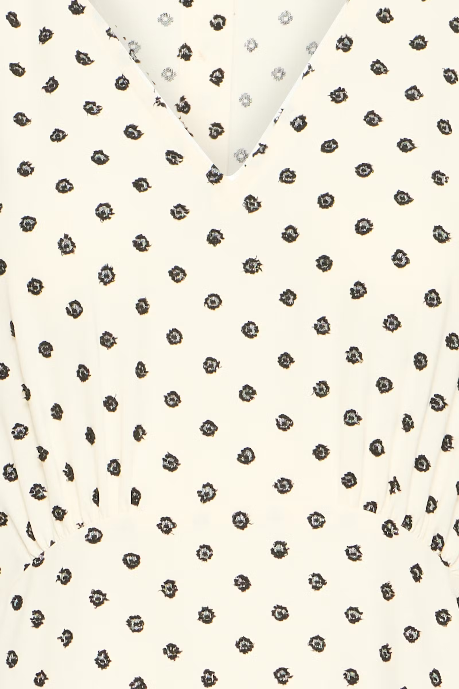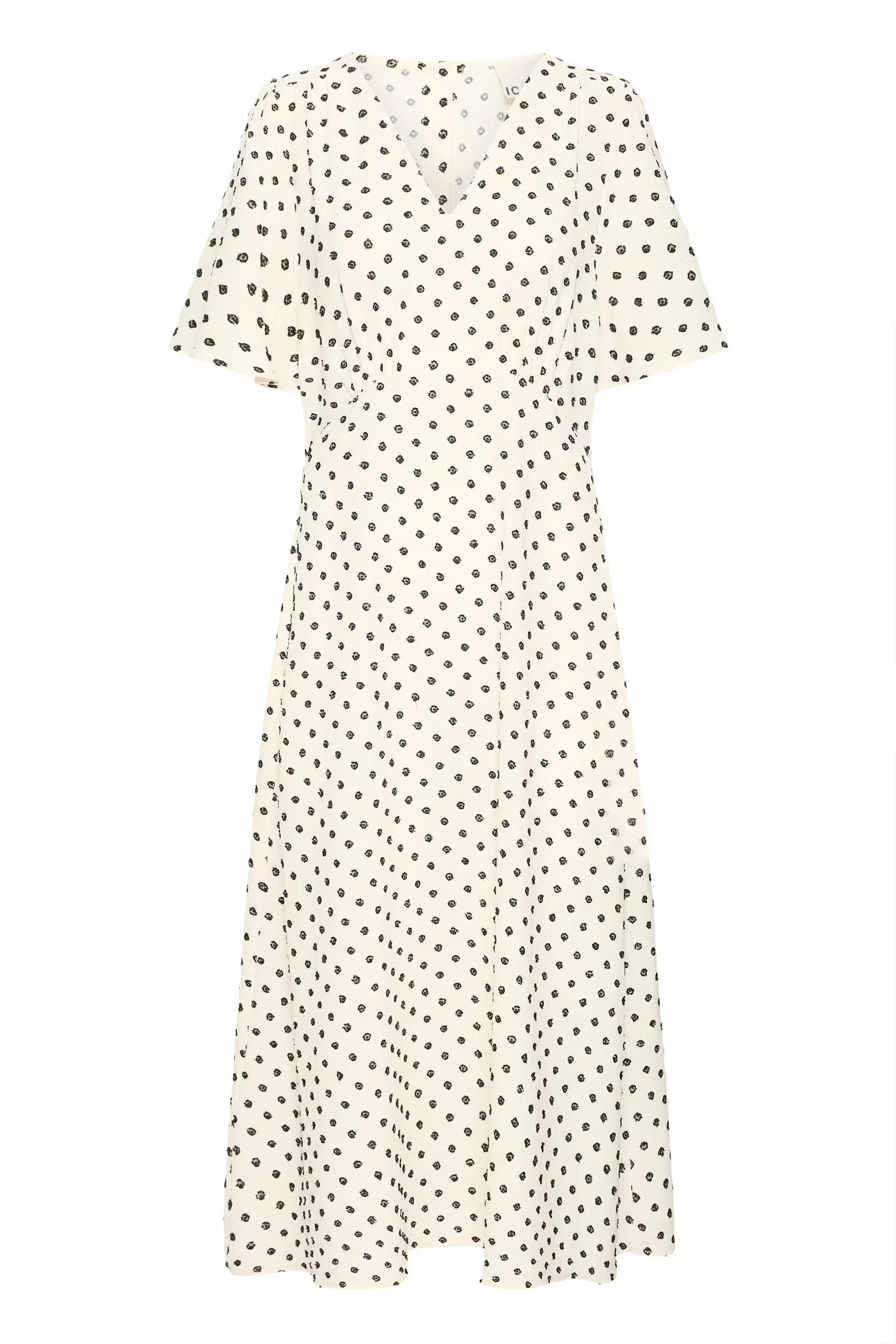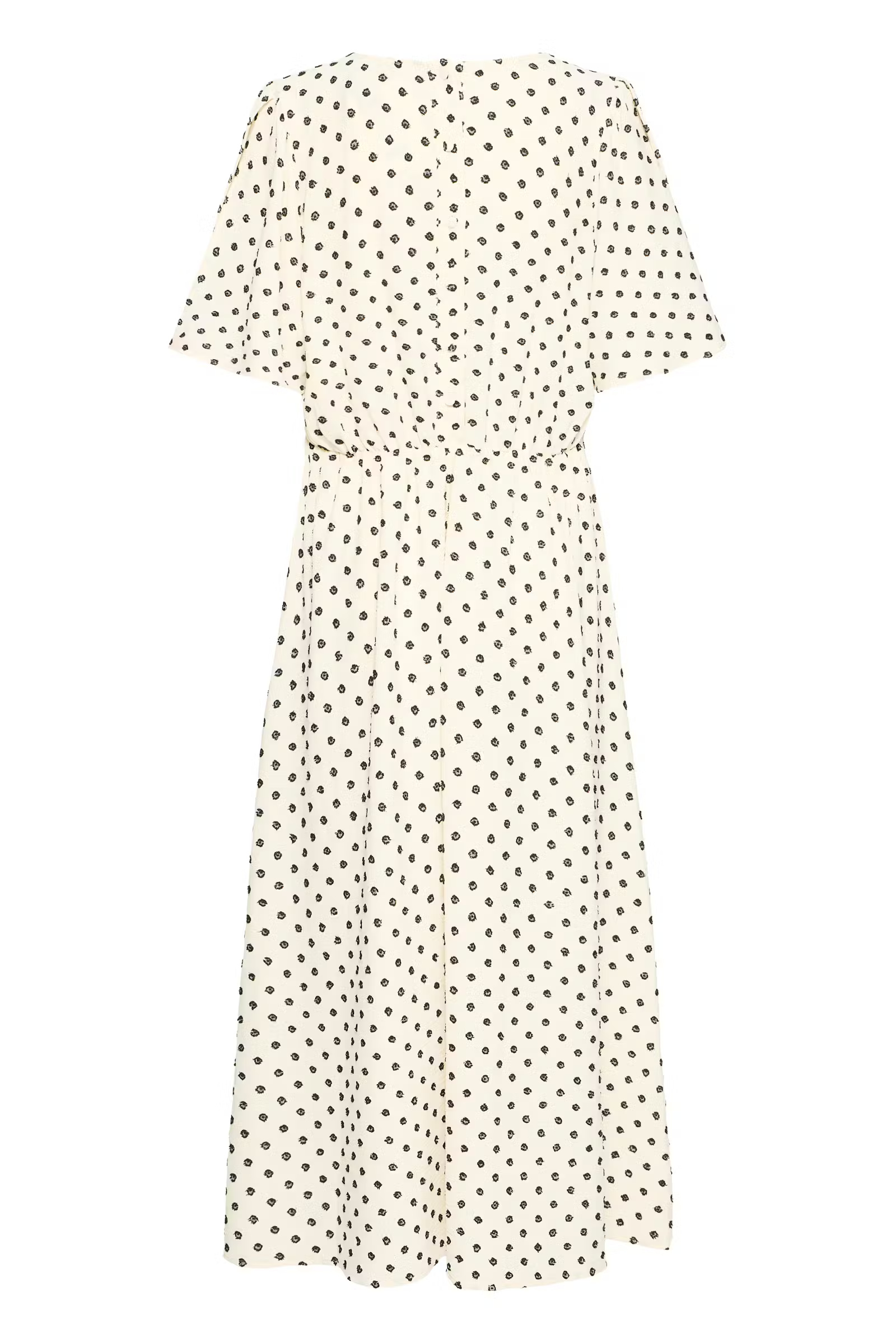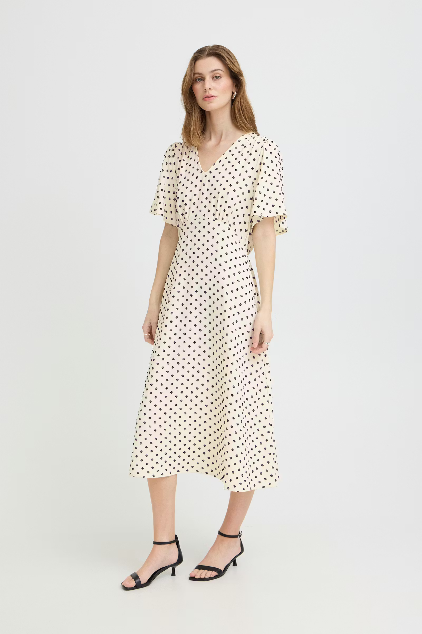Polkadot midi dress with a flattering V-neck, loose fit over the shoulders and a slightly cinched waist. Soft, airy and smooth texture.