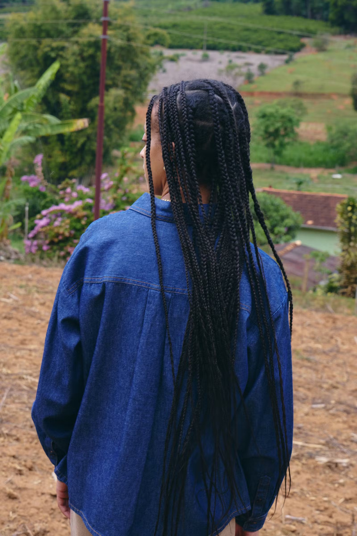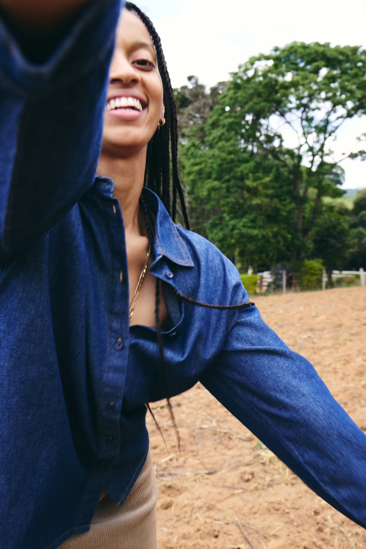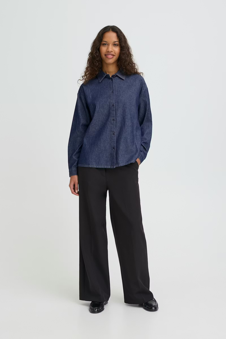 Denim shirt with a straight silhouette, classic collar and long sleeves. Buttons at the front and has clear seams and a soft surface.