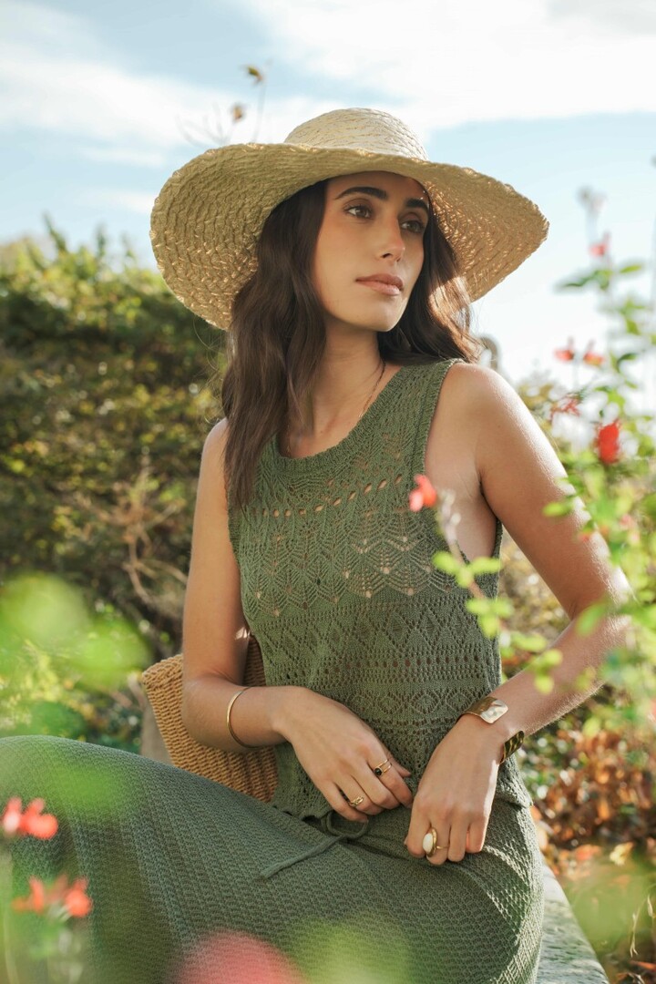 Sleeveless openwork knit crop top.