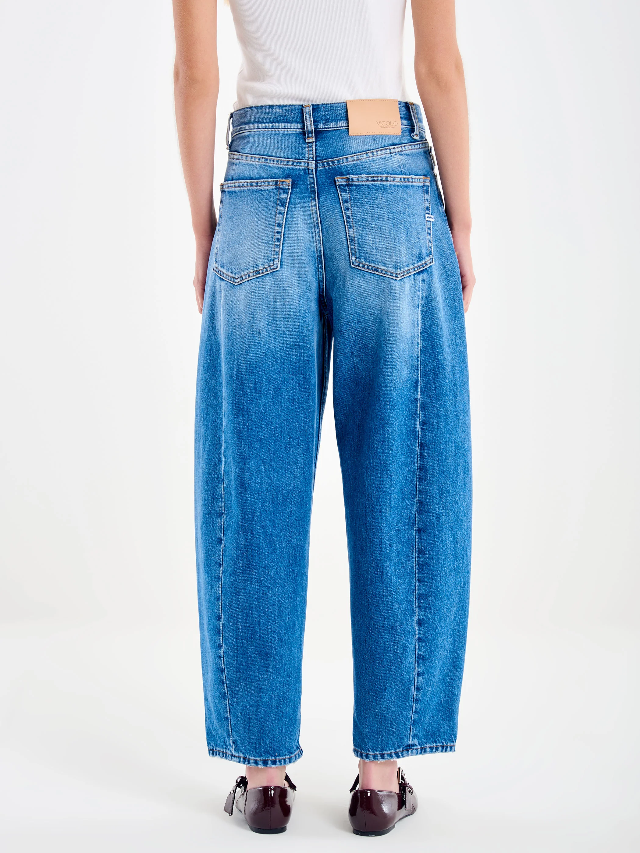 Chiara Barrel mid-rise jeans. Front zip and metal button closure. Five-pocket design. Blue denim. Stitching detail on the leg.