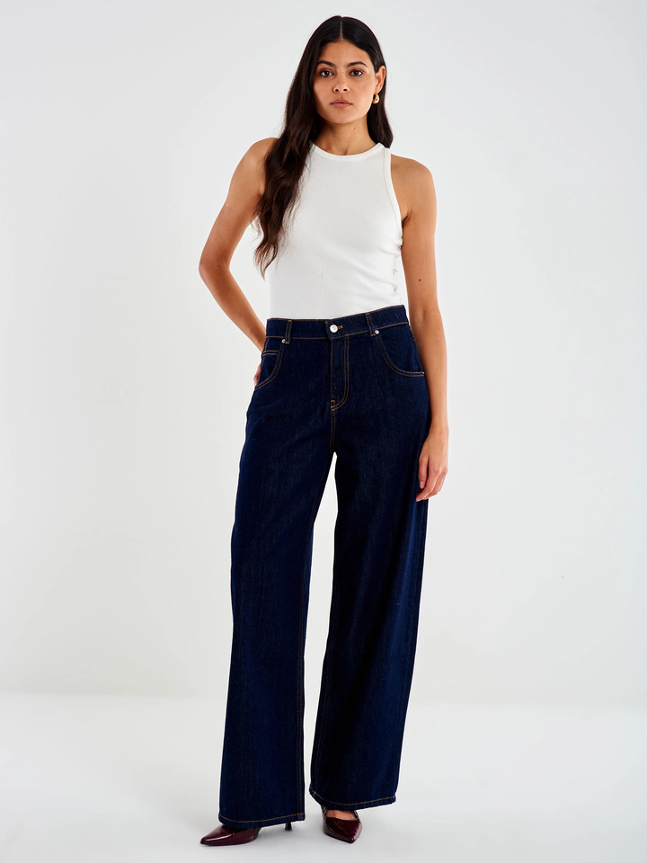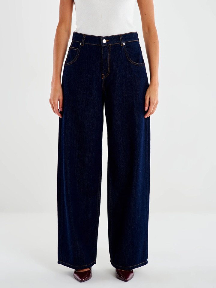 Loose-fitting Mia jeans with five pockets. Front zip and metal button closure. Mid-rise, wide leg. Row wash. Baggy fit.