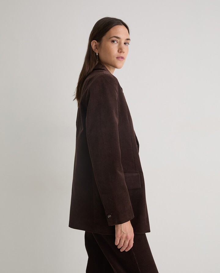 Double-breasted corduroy blazer. Made of 100% cotton. With lining. Wide cut. V-neck with lapels. Long sleeves. Double-breasted. Back slit. Two front pockets with flaps and 1 patch pocket on the chest. 1 inside pocket with button.
