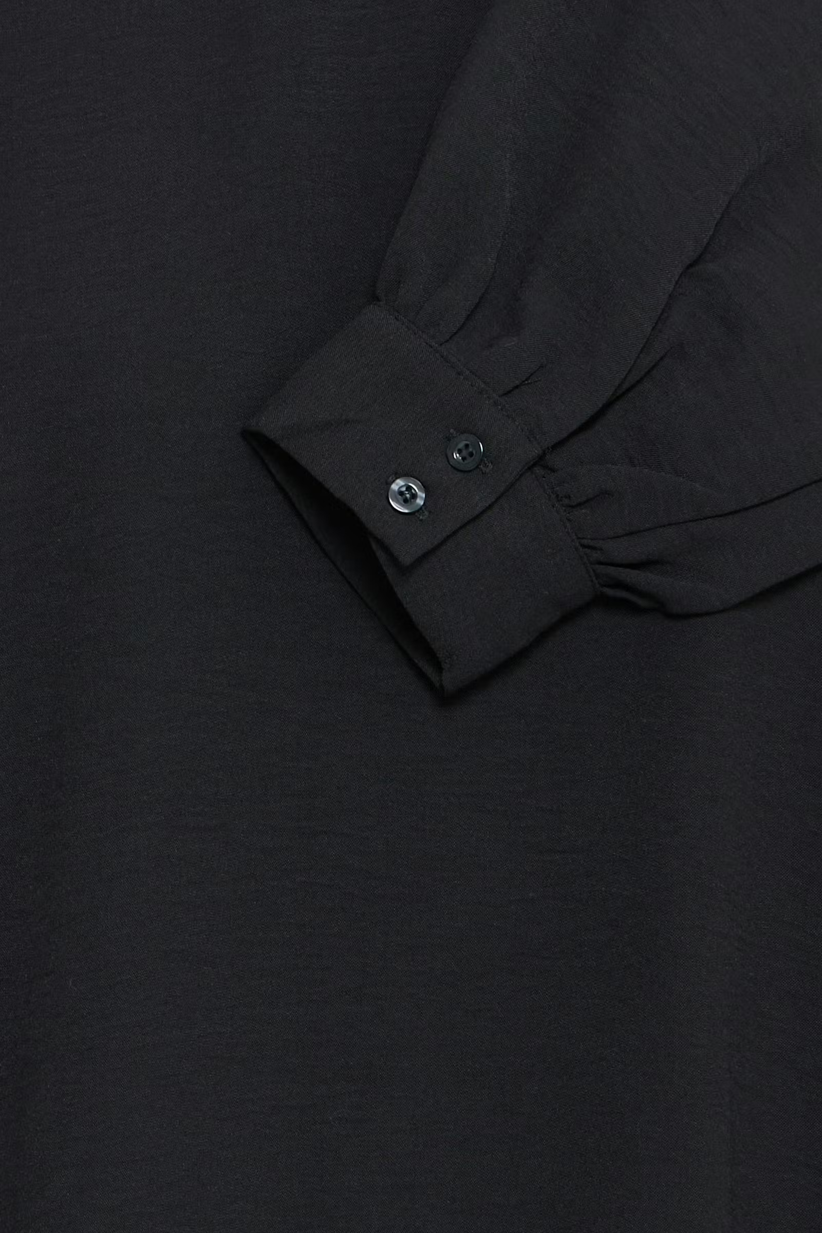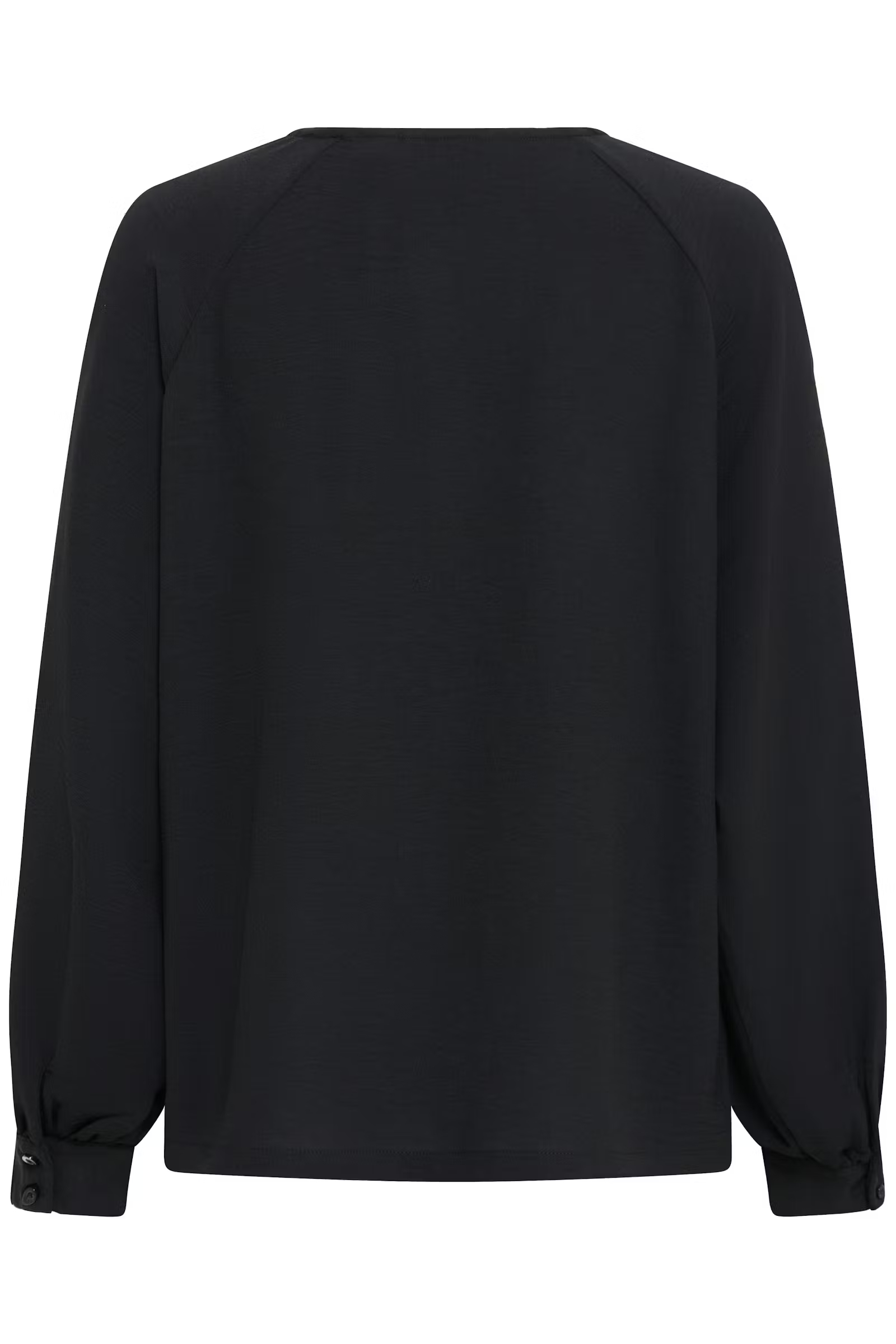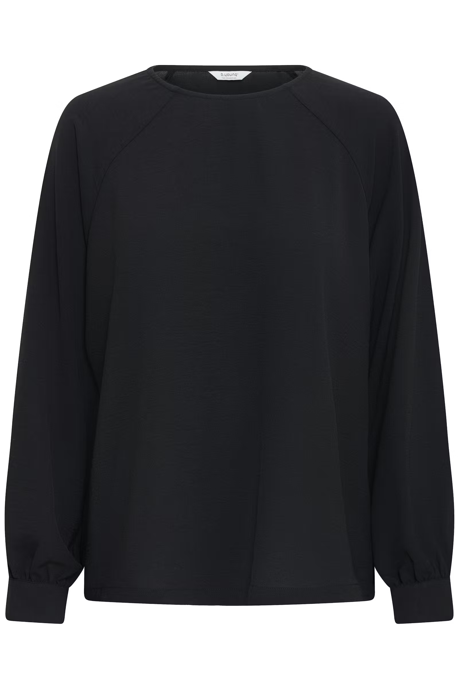 This long sleeve blouse features a straight silhouette with a round neckline and subtle raglan seams. The sleeves are finished with gathered cuffs, adding volume, while the body falls loosely at the hem for a casual look.