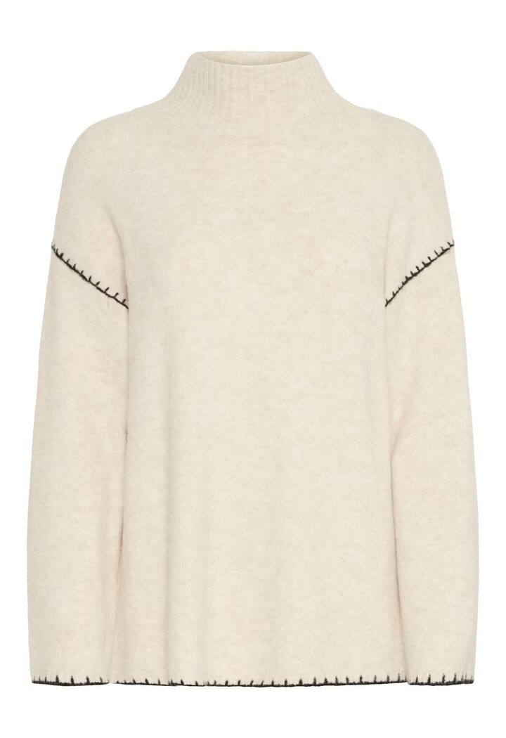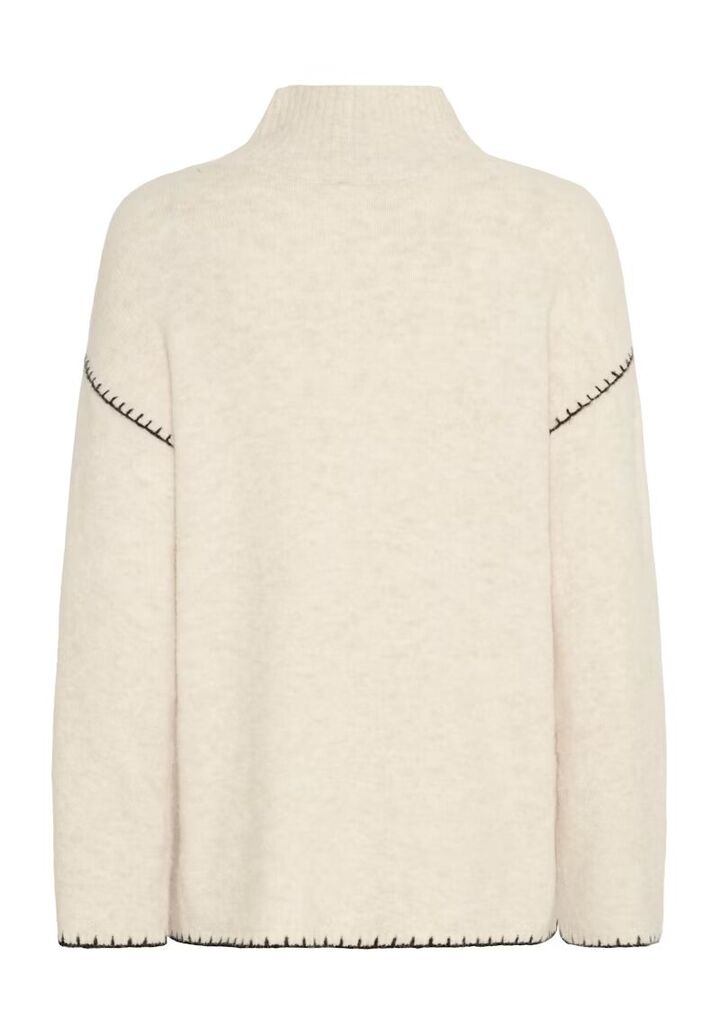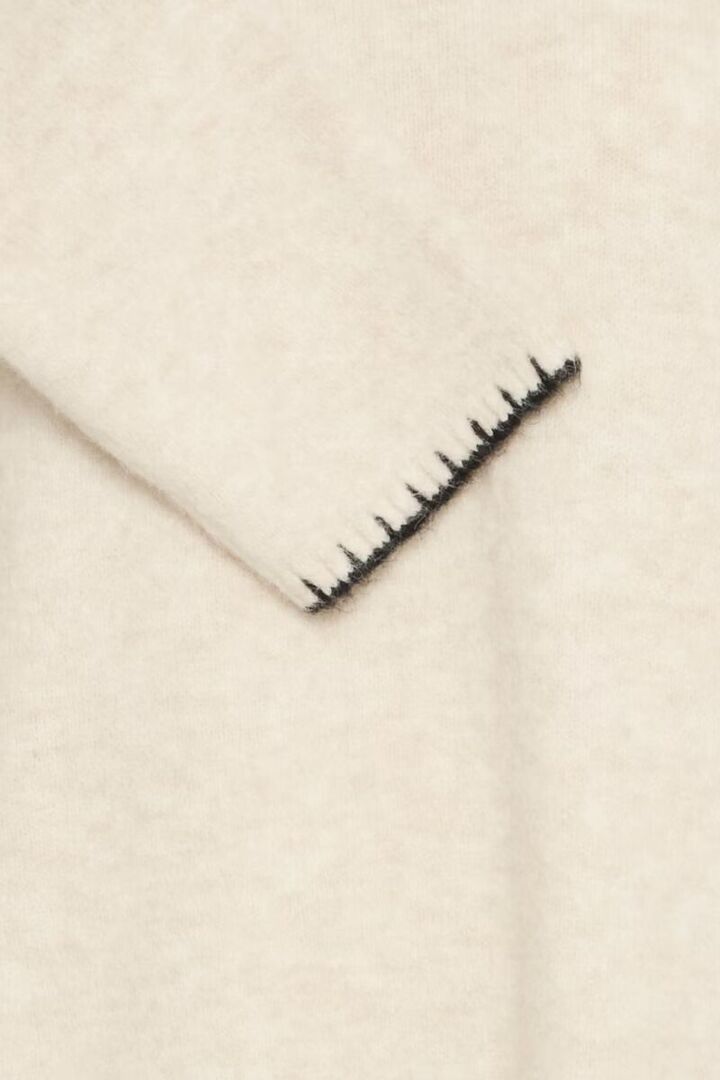 A straight-cut sweater with a soft, textured surface and a relaxed neckline. Long, wide sleeves and contrast stitching along the shoulders and edges give a modern look.