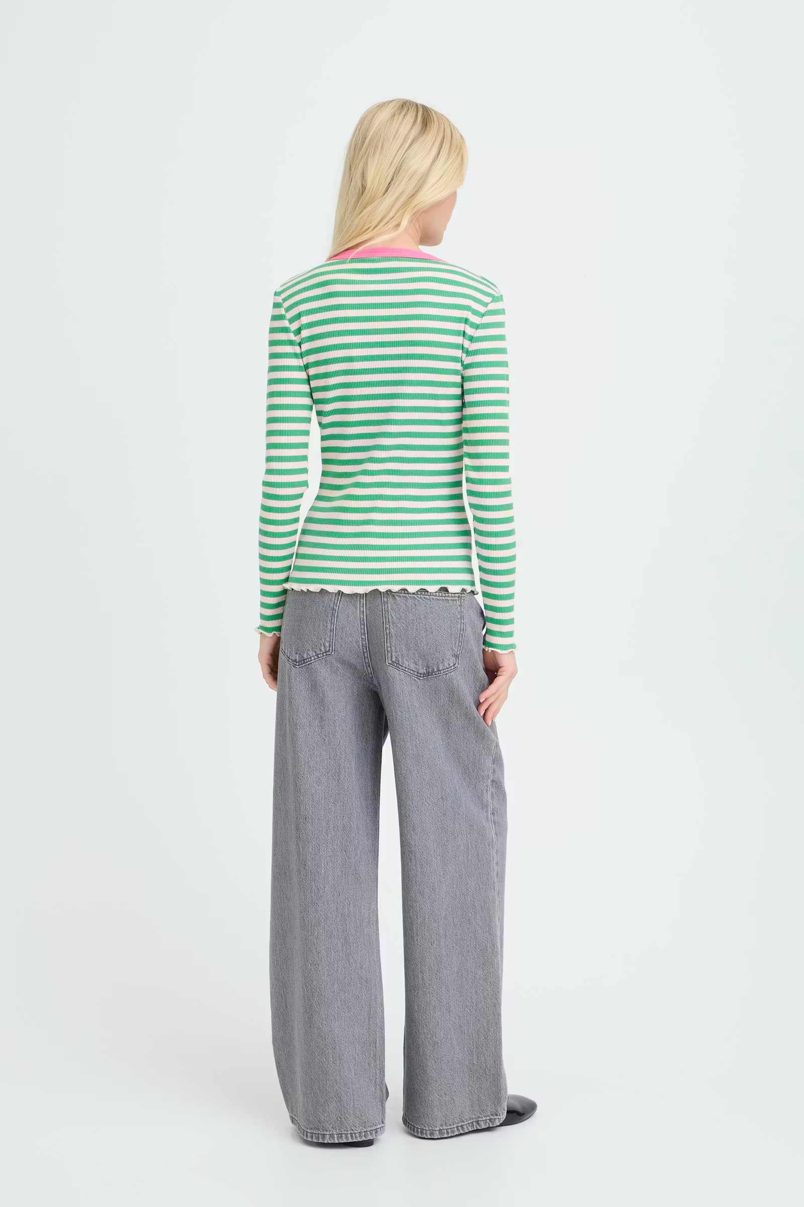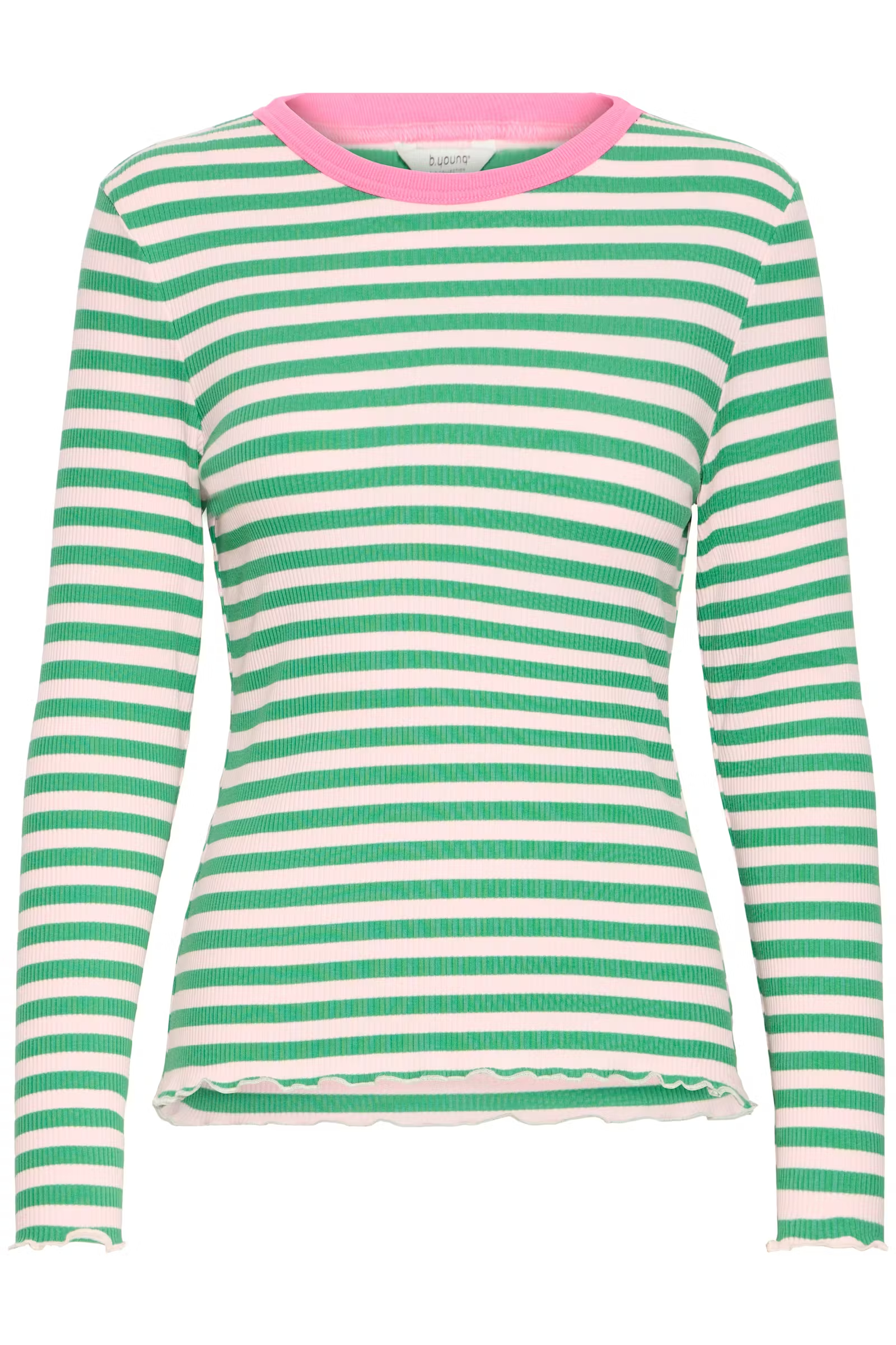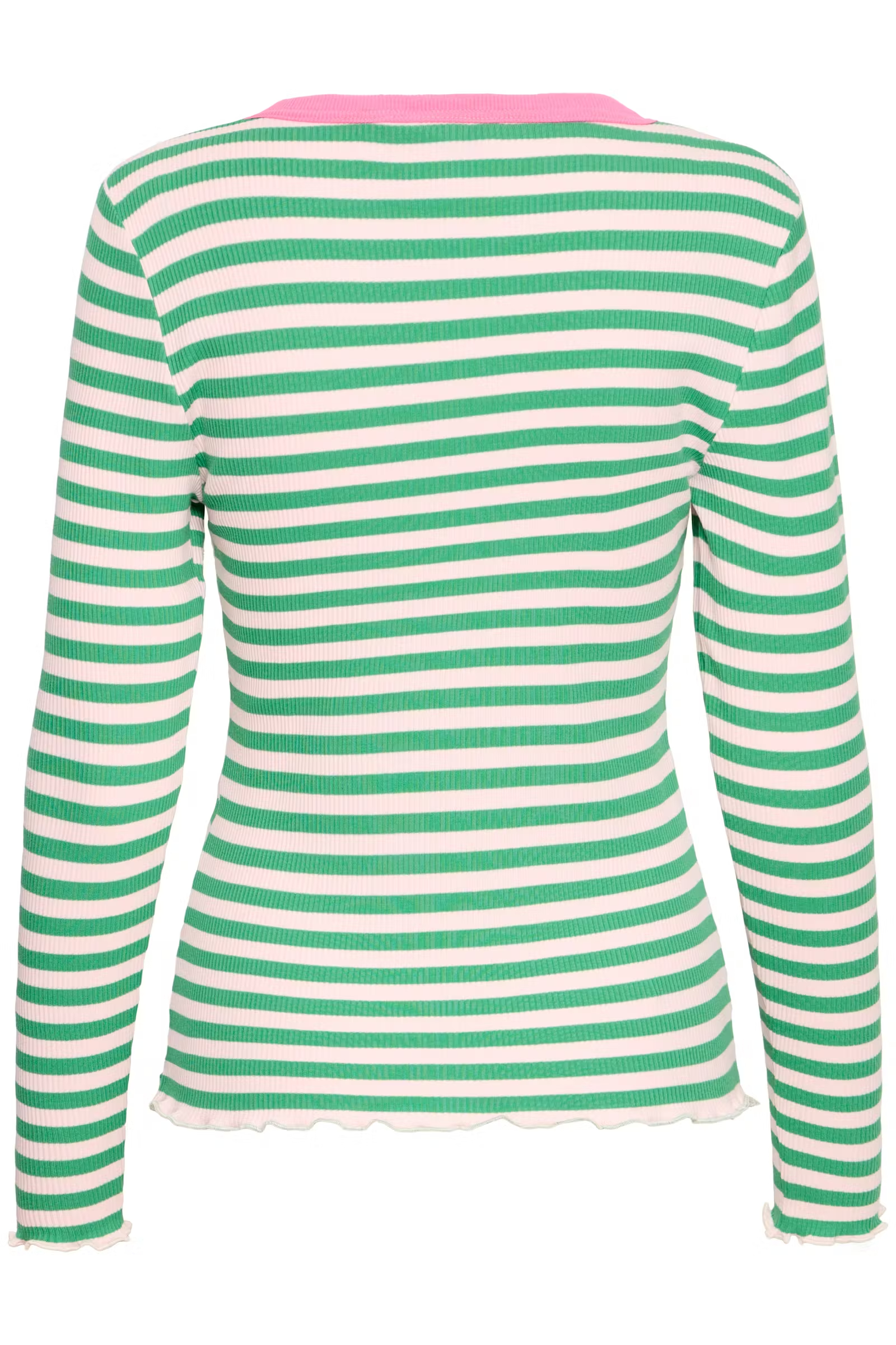 Long sleeve fitted top featuring a ribbed texture and a round neckline visibly trimmed with a contrast band. The hem and cuffs show a lettuce edge finish, adding a delicate, wavy detail to the overall silhouette.