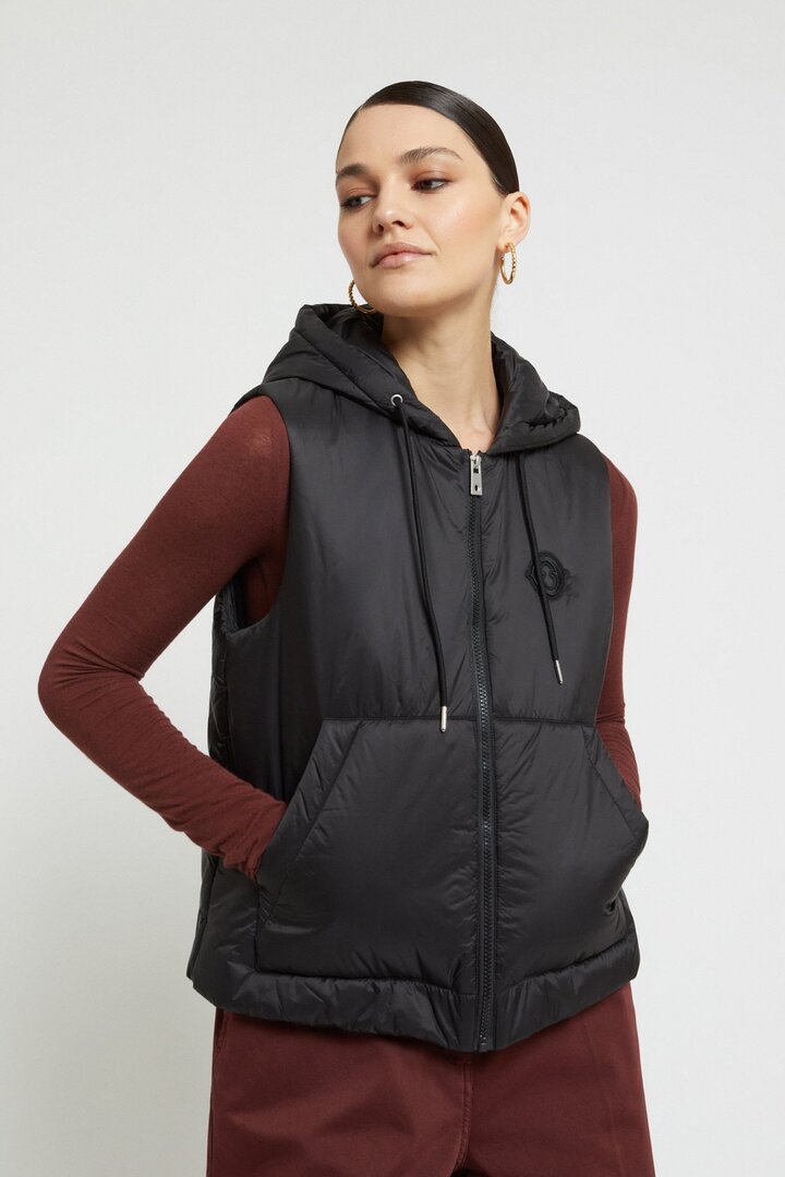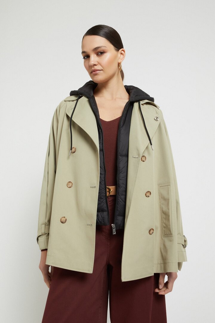 Outerwear composed of two detachable pieces: short double-breasted trench with puff sleeve and hooded gilet with ultralight padding.