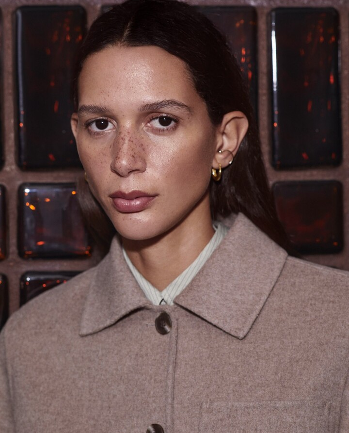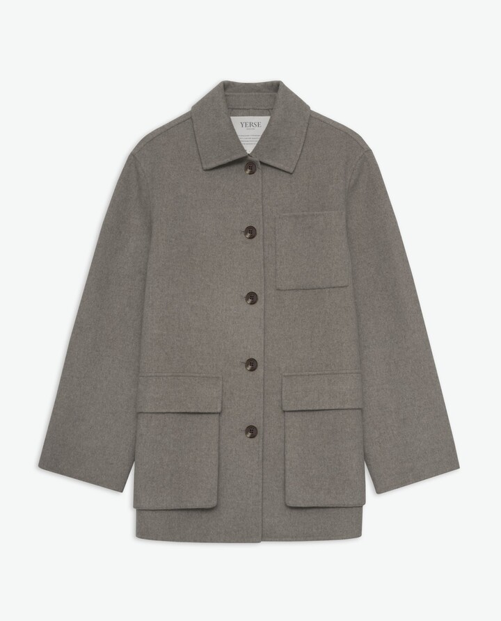 Short regular-fit handmade coat. Double-faced blend of wool and recycled fibres. Collar. Long sleeves. Button front. Two front pockets with flaps and 1 patch pocket on the chest.