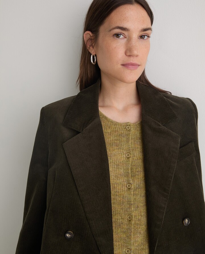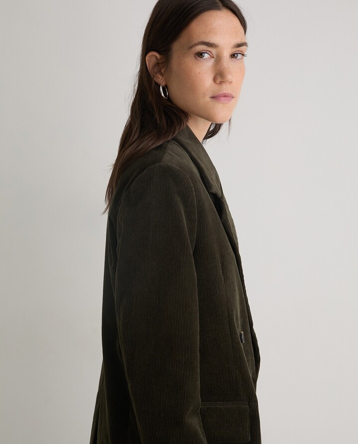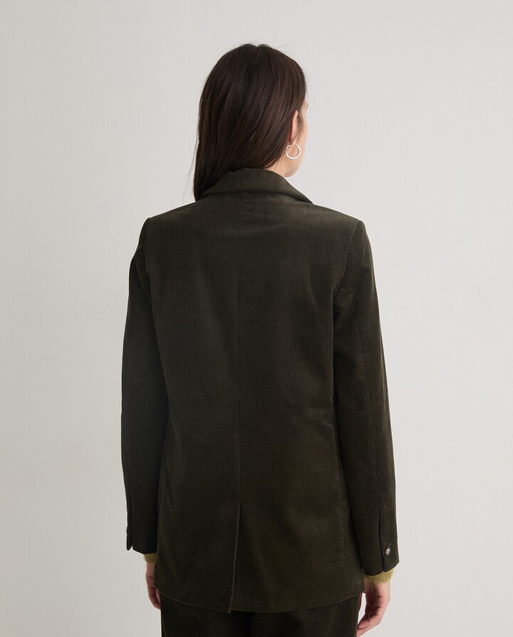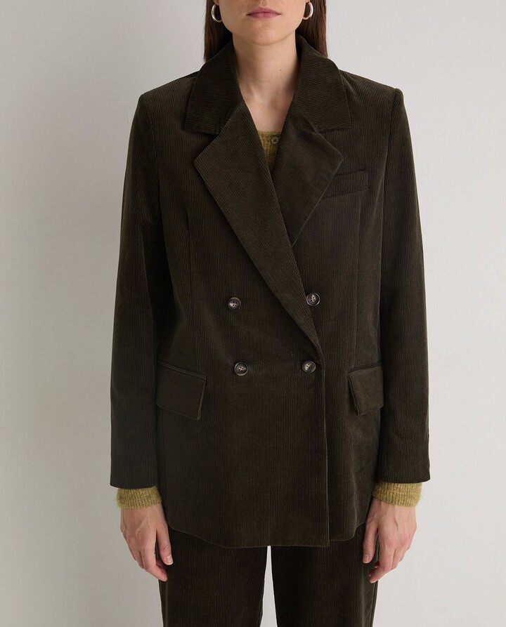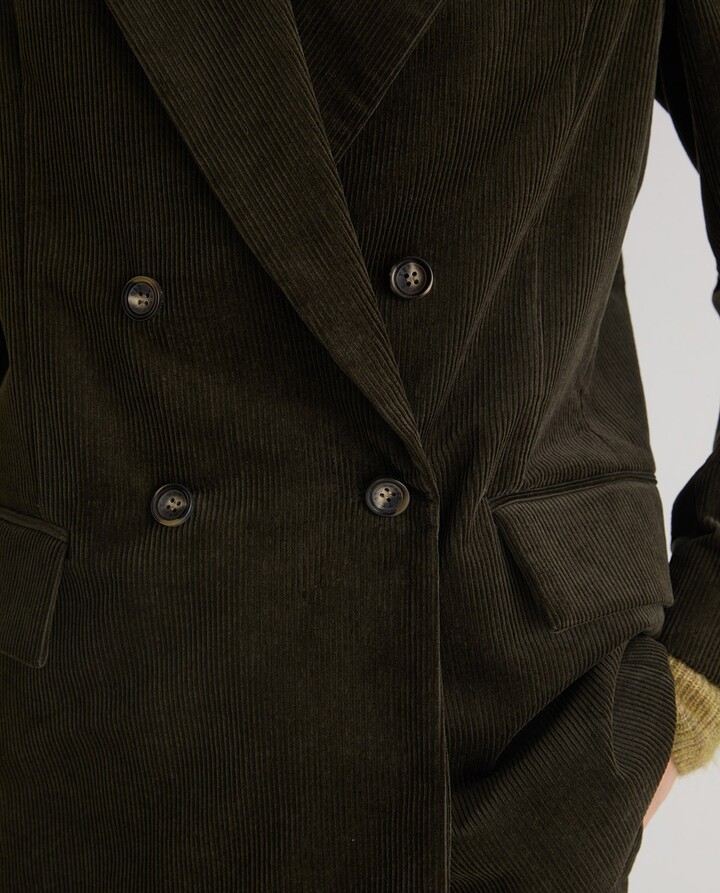 Double-breasted corduroy blazer. Made of 100% cotton. With lining. Wide cut. V-neck with lapels. Long sleeves. Double-breasted. Back slit. Two front pockets with flaps and 1 patch pocket on the chest. 1 inside pocket with button.