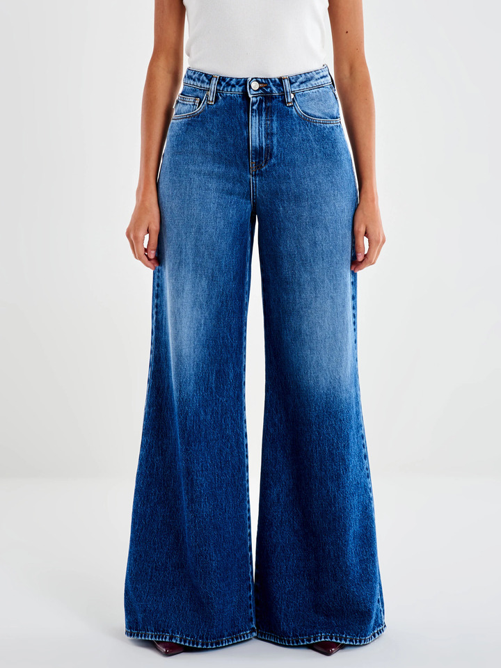 Wide-leg palazzo jeans with a high waist and belt loop. Long leg. Front and back pockets. Front zip and button closure. Lightened blue wash denim.