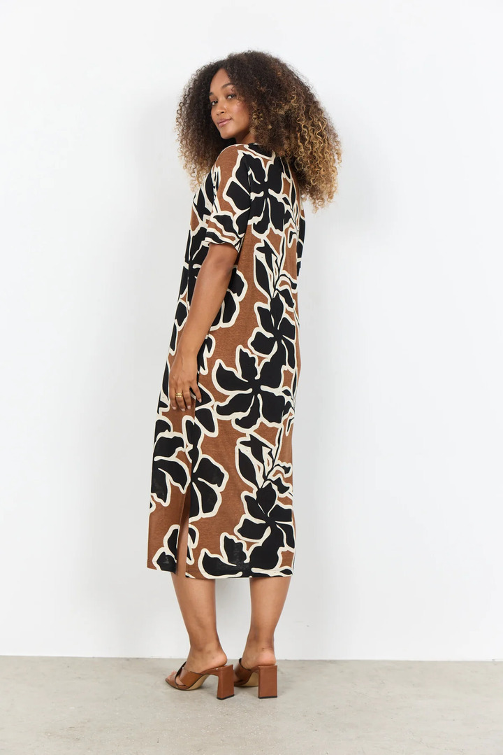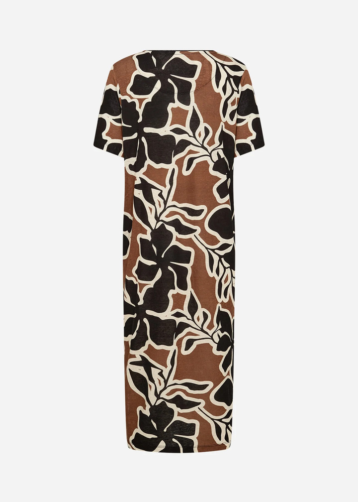 SC-FIOLA 2 dress is made of 55% linen and 45% viscose. This dress features a bold graphic print, a round neckline, and short sleeves, offering a relaxed yet striking look. Pair it with statement jewelry and sandals for a chic appearance.