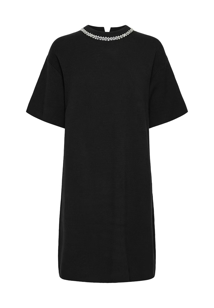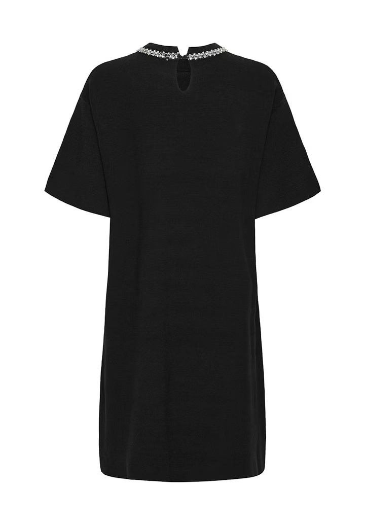 Short, straight dress with a structured silhouette, round neckline with jewel details and half-length, wide sleeves for a refined impression.