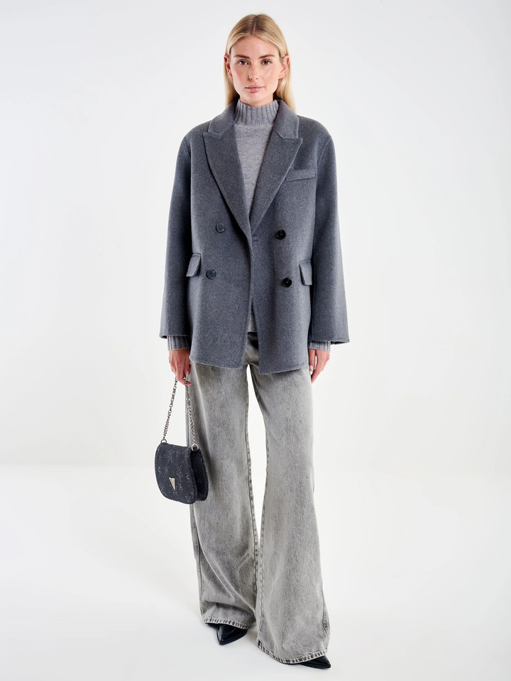 Oversized blazer with lapel collar and long sleeves with buttoned cuffs. Front flap pockets and a welt chest pocket. Double-breasted front closure.