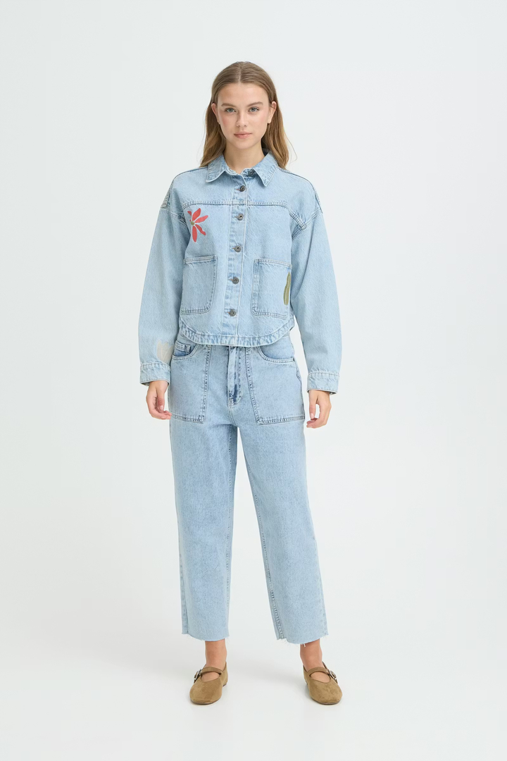 Denim jacket with a straight, boxy fit features large patch pockets and button front. Embroidered flower motifs and a rounded hem complete the modern look.
