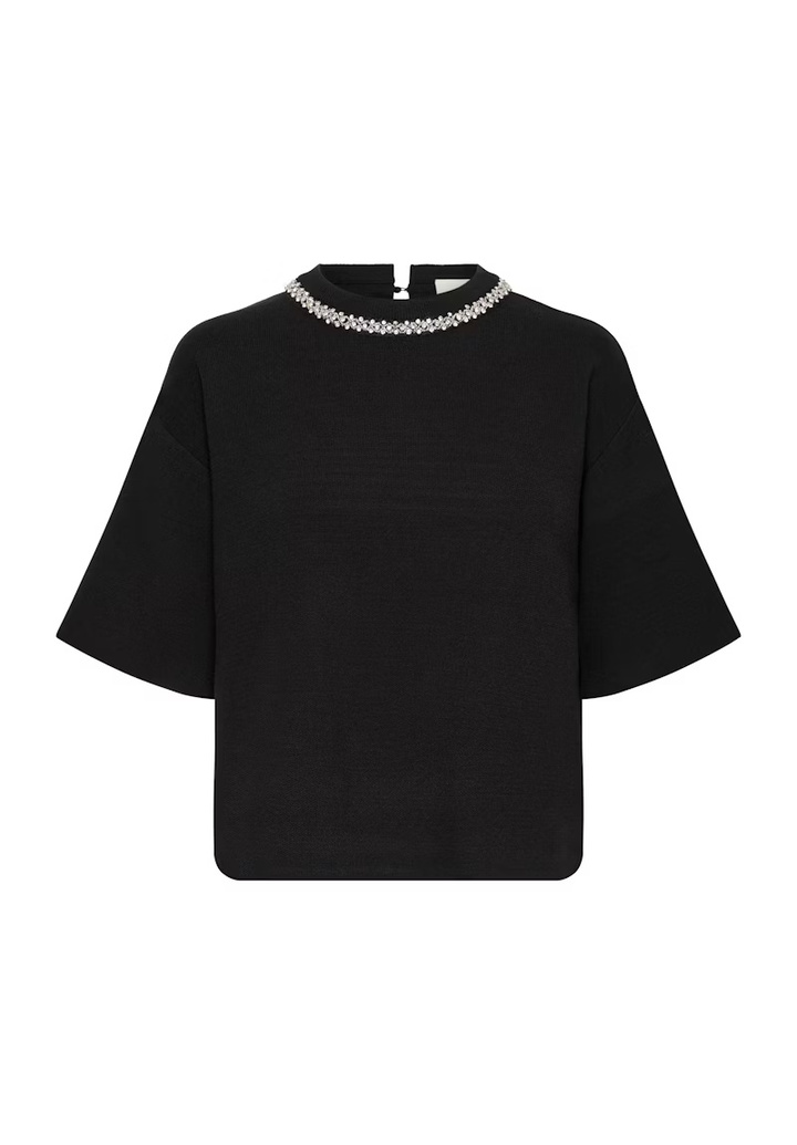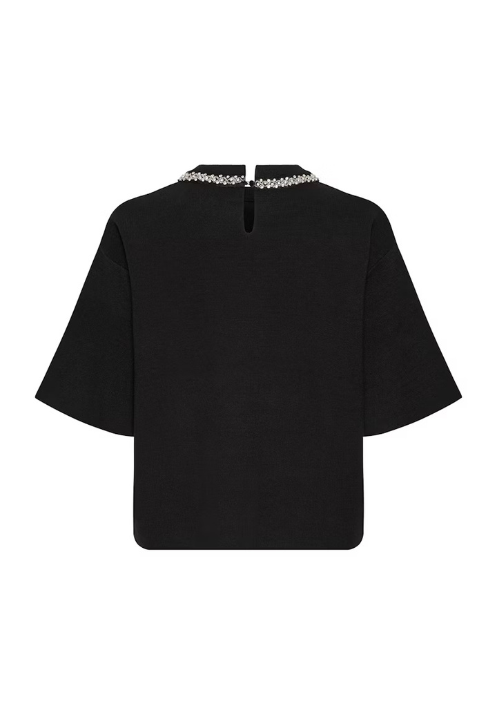 Boxy top with short sleeves and a jewel-embellished neckline, combined with a subtle split. A defined silhouette and soft finish create a modern look.