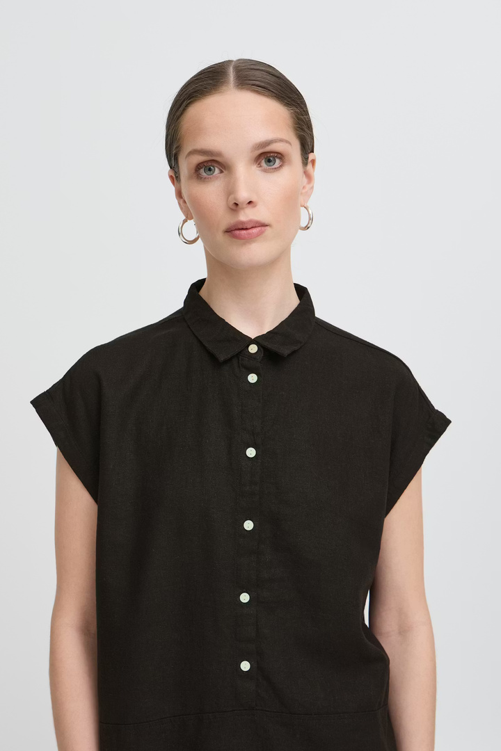 Short-sleeved shirt with button closure, classic collar, relaxed and slightly boxy fit and soft, smooth surface. Discreet panel detail at the bottom gives a modern look.