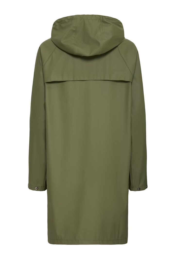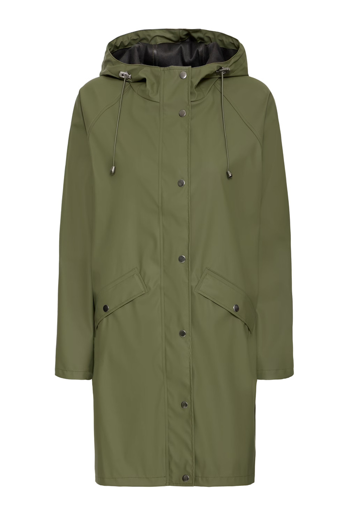 This rain jacket offers a relaxed fit and practical mid-thigh length for everyday comfort. Features an adjustable hood, secure snap closures, and roomy flap pockets for added functionality.