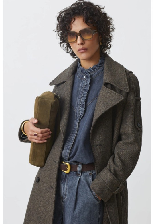 -Long woollen coat with belt-Double front buttoned closing-Tabs on the sleeves-Two side pockets-Remo..