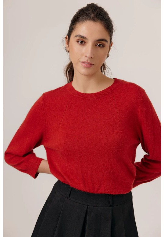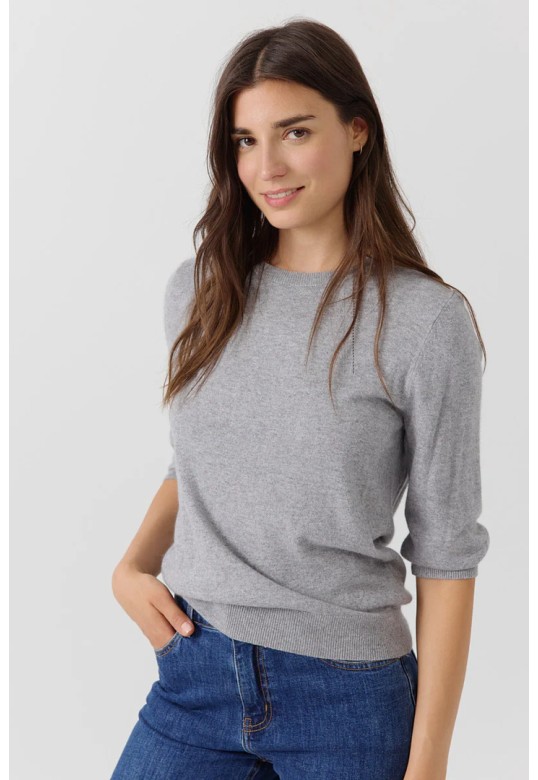 Three-quarter sleeve crew neck sweater. Straight cut, fine knit. Subtle vertical stripe details to s..