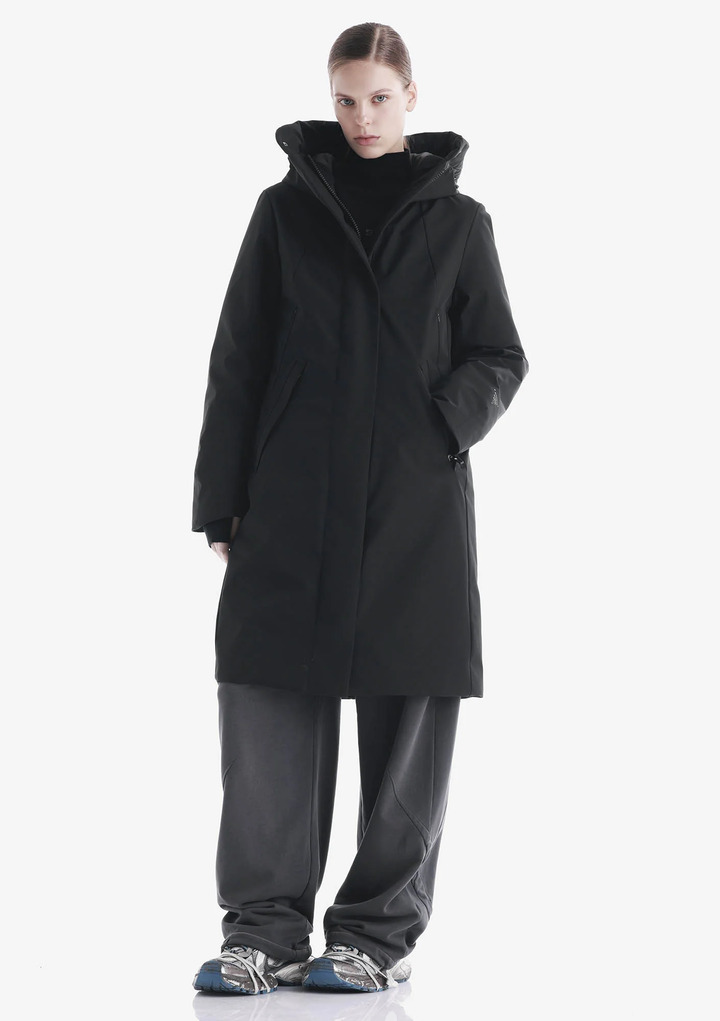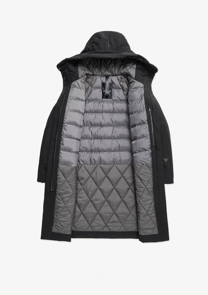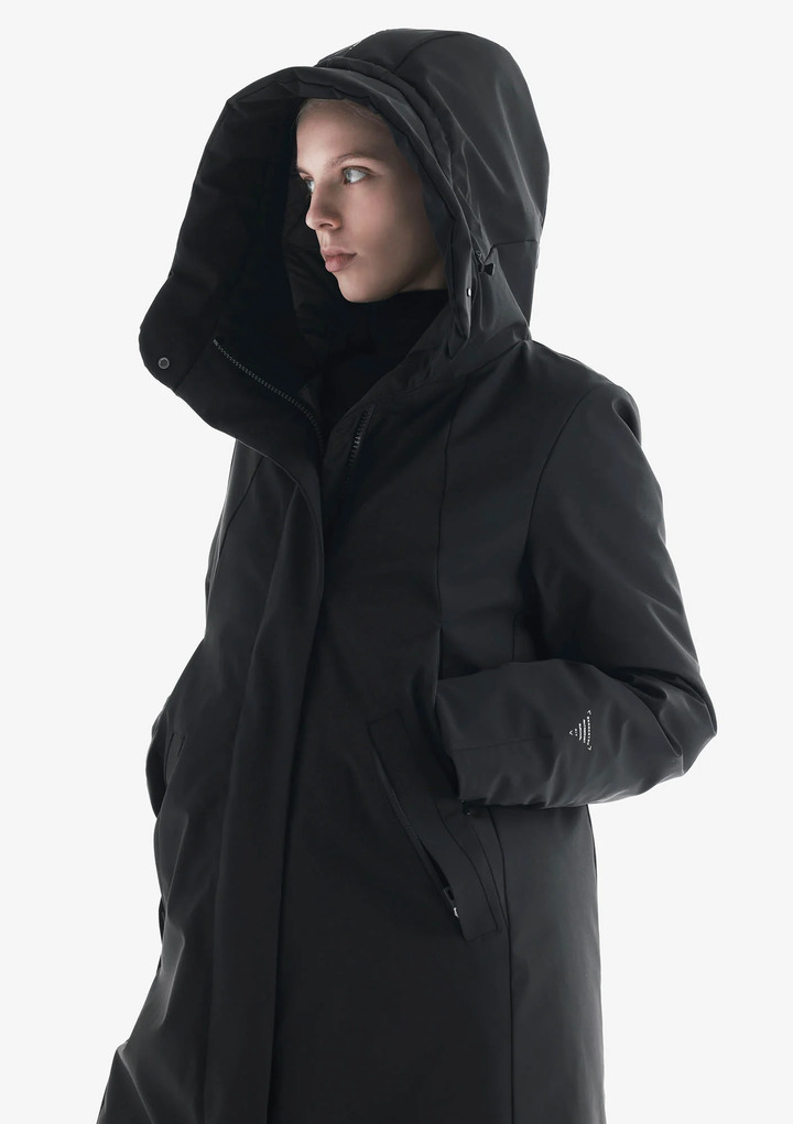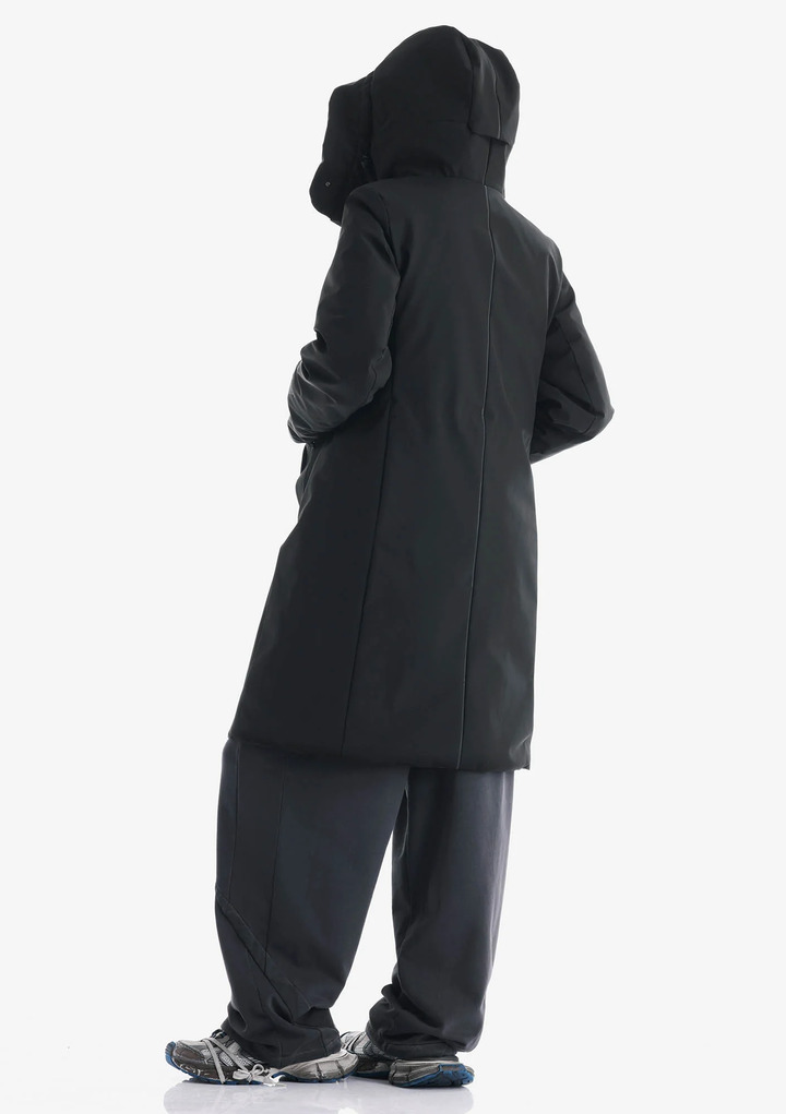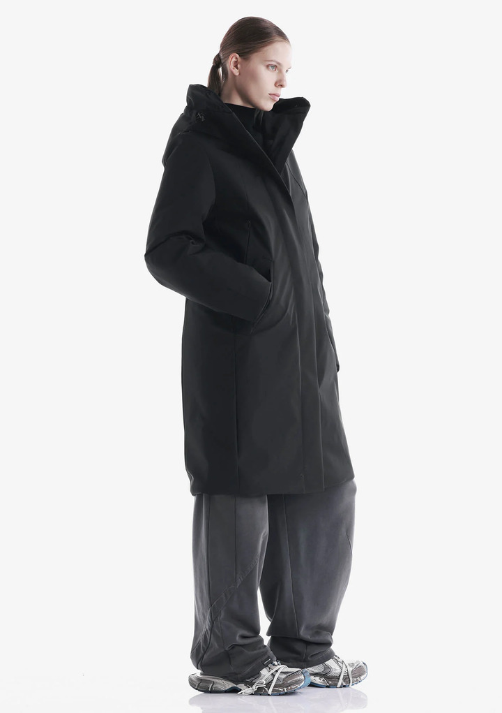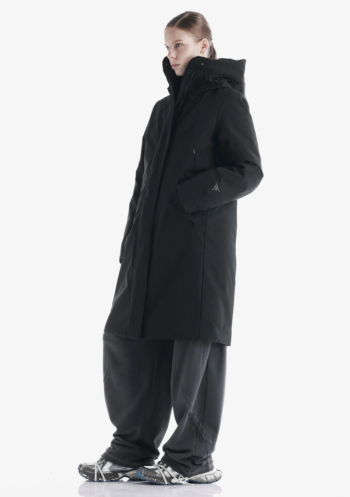 GAIA long parka is made from advanced fabric with waterproof taped seams, designed for protection on the move. Heat Contouring™ enhances warmth in key areas. The hood features a high collar and reinforced flap, while an internal waist drawcord and elastic cuffs ensure a precise fit. Magnetic pockets and concealed zippers maintain a clean silhouette without sacrificing functionality.
