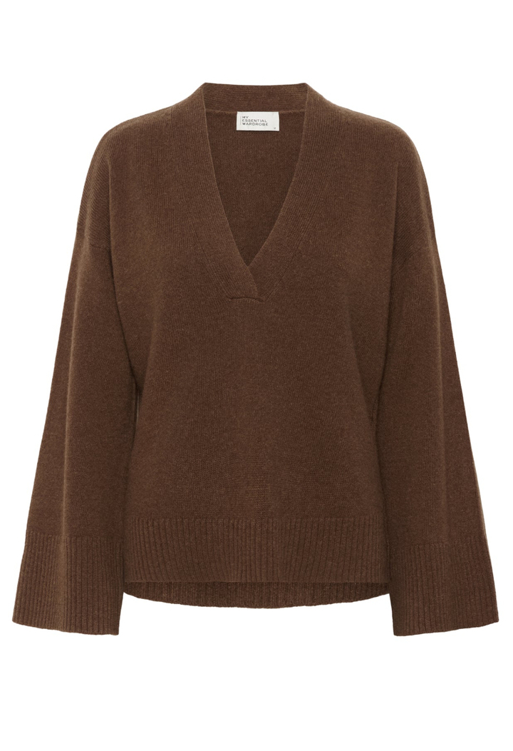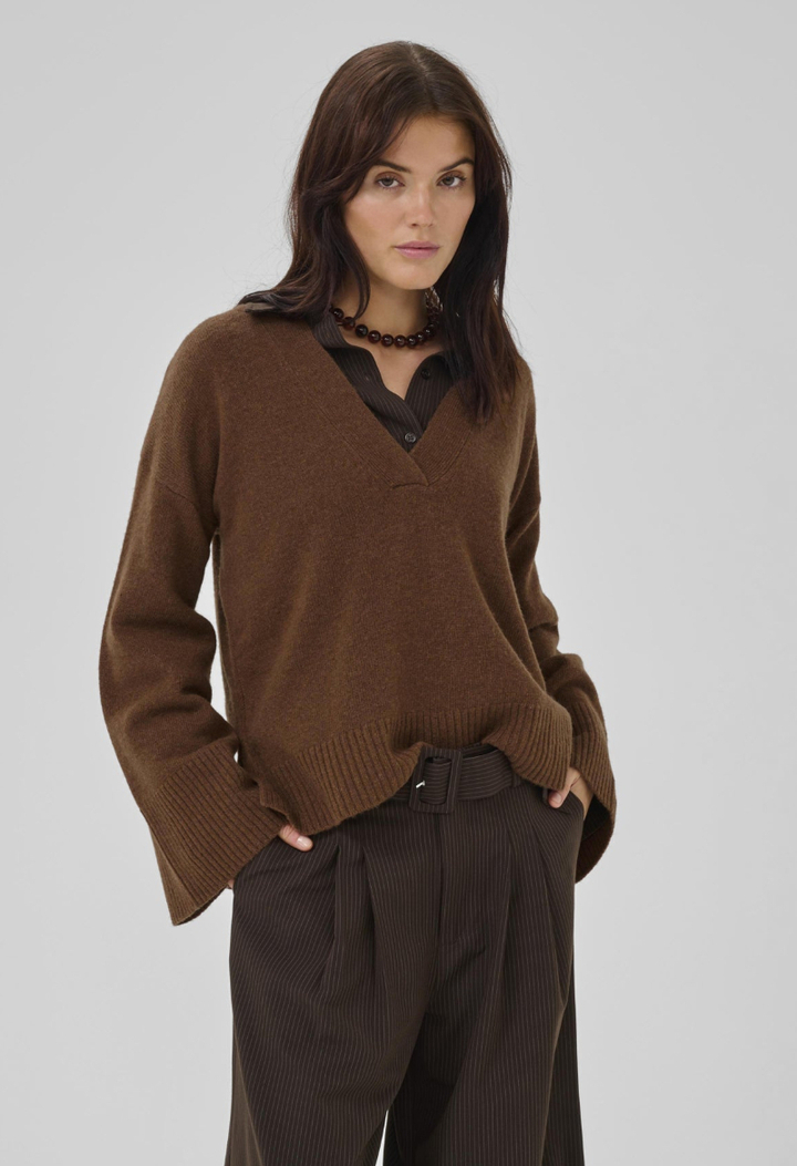 Knitted sweater with a V-neck, relaxed fit and wide sleeves. Ribbed hem for a comfortable and modern style, perfect for everyday wear and the office.