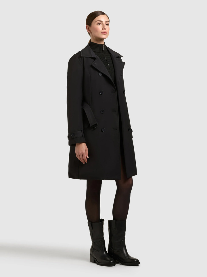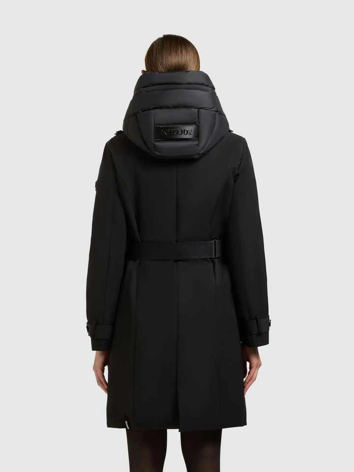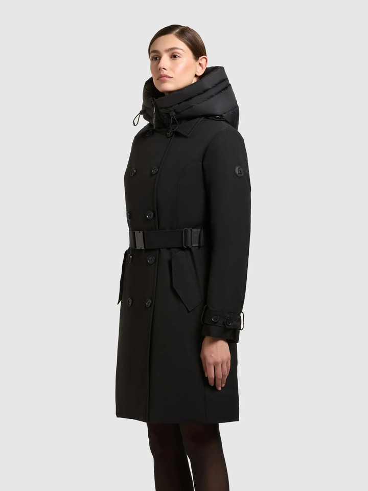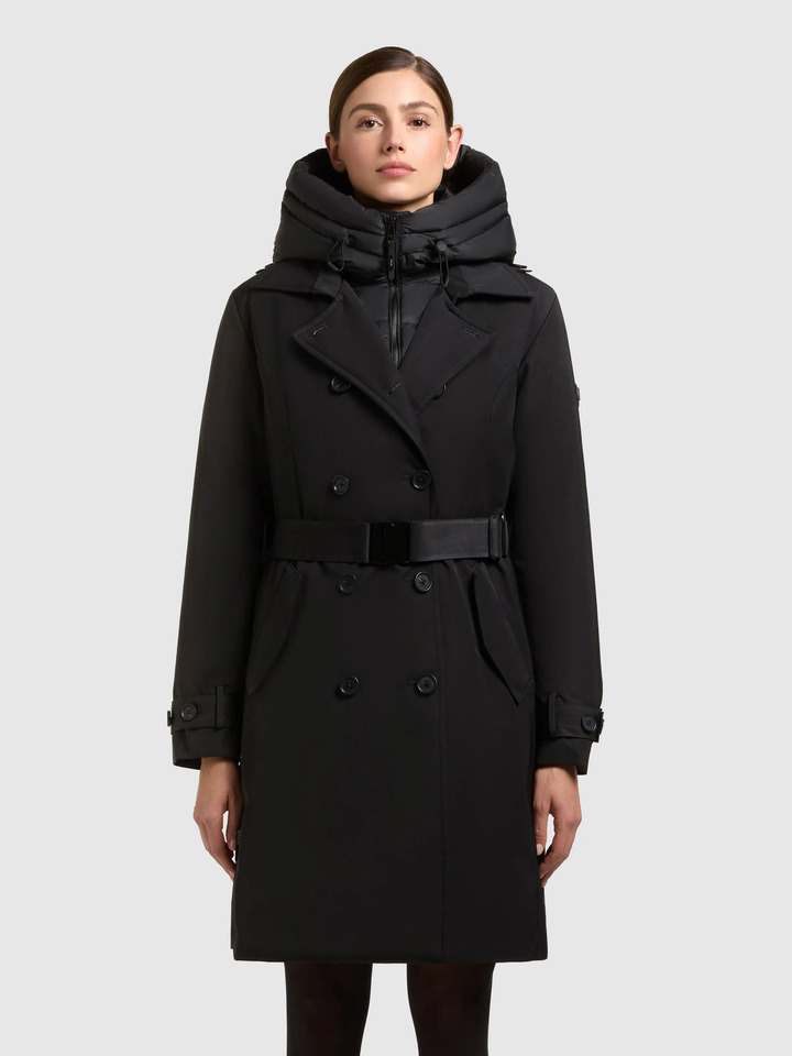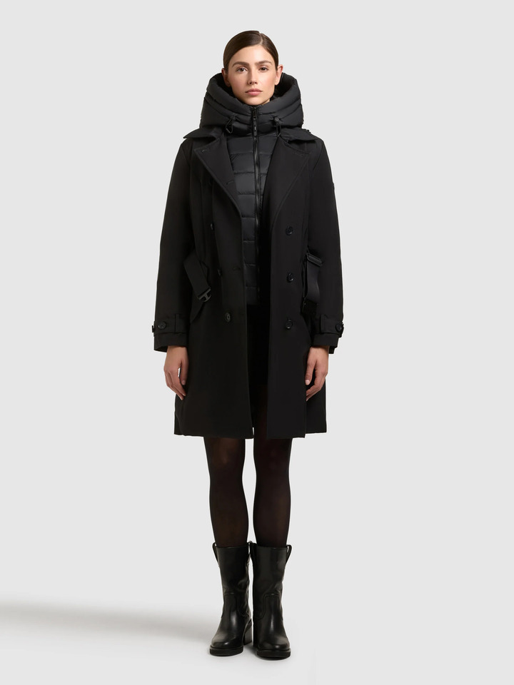 A removable quilted insert with a high-closing hood and an overlapping front with a button placket give the khujo GORA coat a distinctive look that's sure to turn heads. The classic notched lapel, a back vent with a magnetic button, shoulder straps, and a detachable fabric belt with a metal buckle add stylish touches to this lined trench coat. Buttoned cuffs and flap pockets with magnetic closures complete the short coat.