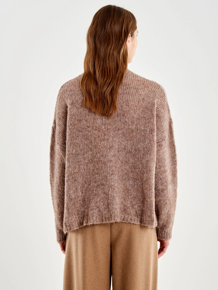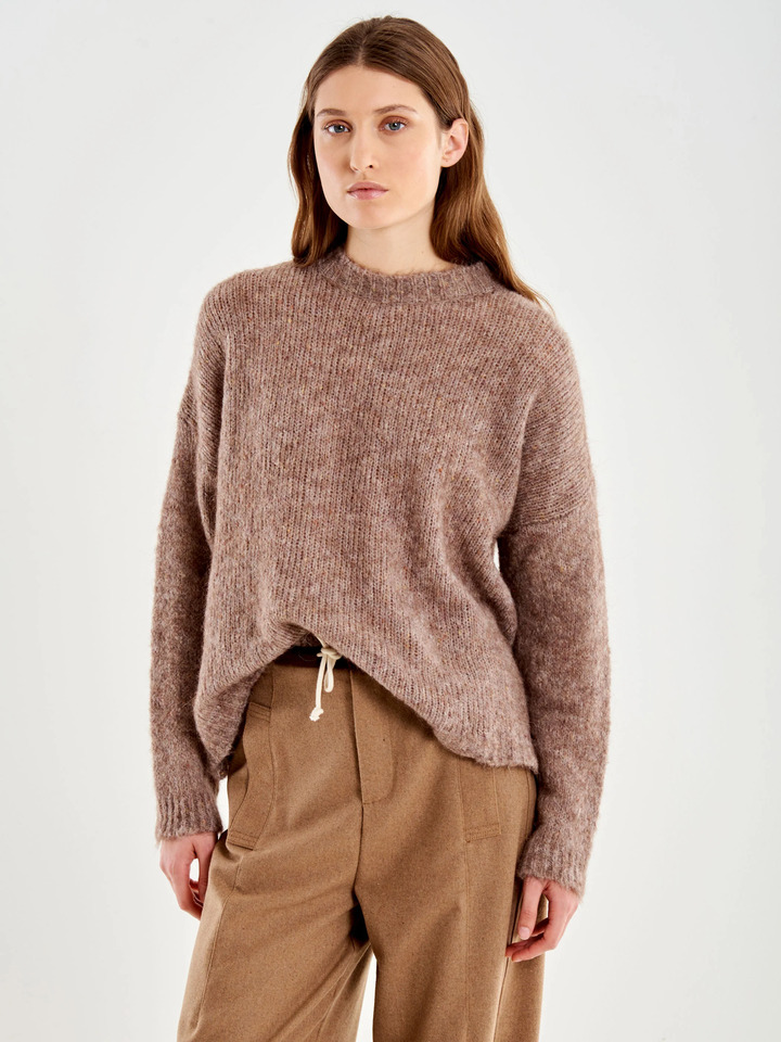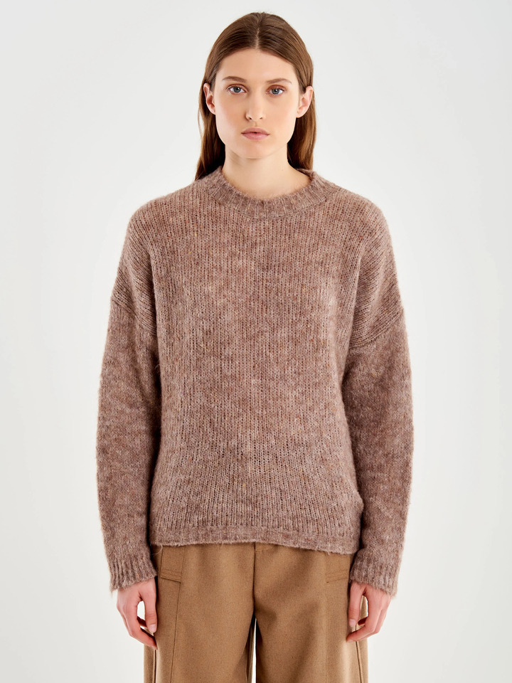 Long-sleeved crew neck sweater. Ribbed knit trim detail.