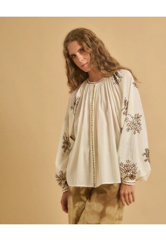 Shirt with sewn embroidered scarf, pocket at the chest, side buttons and front button fastenin..