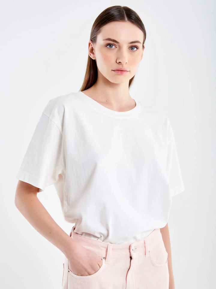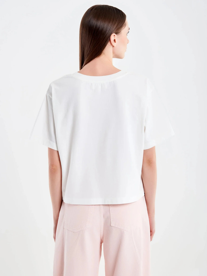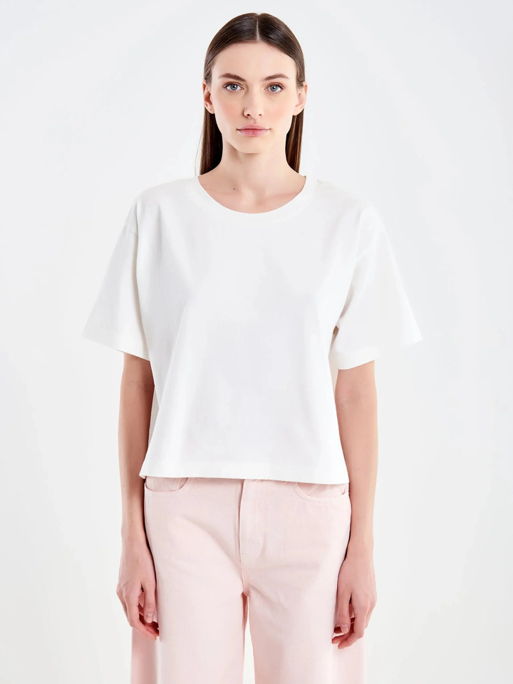 Short-sleeved crew-neck T-shirt. Cropped model.