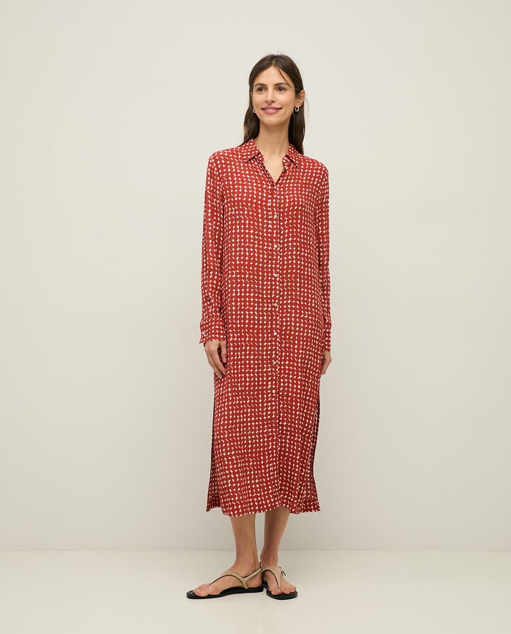 Long EcoVero™ viscose crepe dress Classic collar and front fastening with buttons. Long sleeves with button cuffs, straight cut with flowy drape. Side slits at the hem. Geometric print in terracotta tones. Length from shoulder: 120 cm (size S).